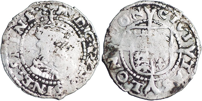 EDWARD VI. 1547-1553. Penny. In the name of Henry VIII (1547-1551). London, Roman letters. H D G ROSA SINE SPINE, crowned bust facing. ® CIVITAS LONDON, square-topped shield on long cross fourchée. Spink # 2417. North 1883. 15.7mm. Note obverse legend reads SPINE in error for SPINA. |