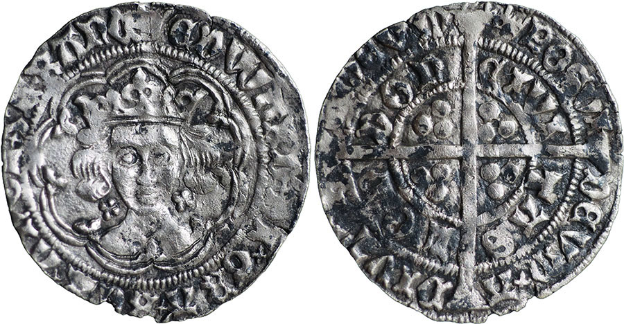 Groat. Light coinage (1464-1470). London. Initial mark Crown. EDWARD DI GRA REX ANGL Z FRANC Crowned bust facing within a tressure of arches; quatrefoils at neck. ® POSVI DEVM ADIVTORE MEVM; CIVITAS LONDON Long cross pattée dividing legends; three pellets in each angle. Spink # 2000. North 1570. |