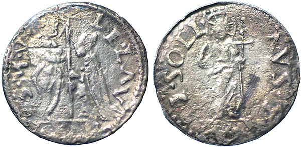 Doge Leonardo Lauredan. 1501-1521. Silver Venetian Soldino. LE LAV DVX S M V. Doge kneeling before Saint Mark. ® LAVS TIBI SOLI. Haloed figure of Christ holding a cross. 0.3g. 12mm. These coins circulated (illegally) in England from the late 14th to the 16th century and were known as ’Galley Halfpence’. |