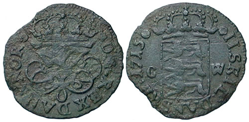 Frederik IV of Norway. 1699-1730. 2 Skillings. D G REX DAN & NOR. Crowned King's monogram. ® II SKIL DANSKE 1715. C W beside crowned Shield of Denmark. 15mm. Green patina. |