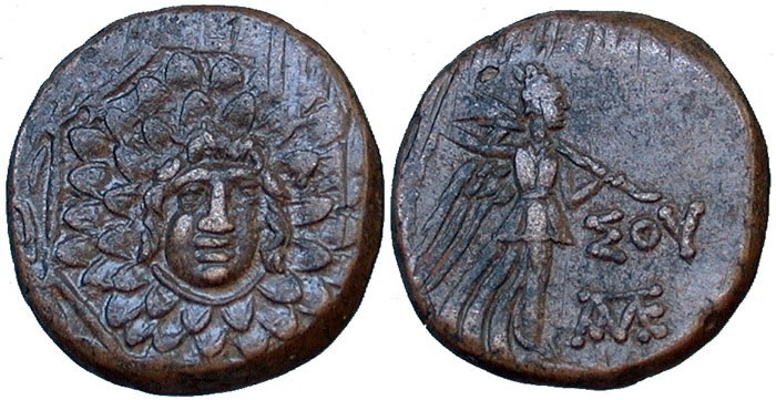 PONTOS. Amisos. Æ (19.4mm). Late 2nd to early 1st cent BC (time of Mithradates). Aegis, with Gorgon's head at centre. ® Nike advancing right carrying palm branch. 8.0g. |