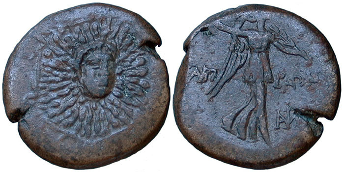 PONTOS. Kabeira. Æ (21.2mm). Late 2nd to early 1st cent BC (time of Mithradates). Aegis, with Gorgon's head at centre. ® Nike advancing right carrying palm branch. 9.5g. Scarce. |