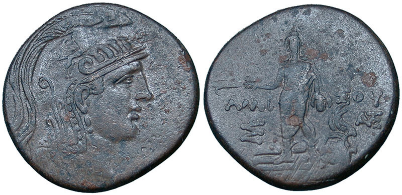 PONTOS. Amisos. Æ (30.7mm). Late 2nd to early 1st cent BC (time of Mithradates). Head of Athena right, wearing triple-crested helmet ornamented with Pegasos. ® Perseus standing facing, holding harpa and head of Medusa, whose decapitated body lies at his feet. 19.7g. |