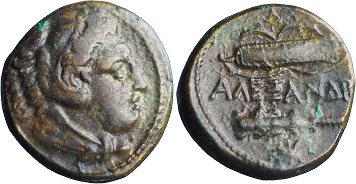 THE MACEDONIAN KINGDOM. ALEXANDER III (The Great). 336–323 BC. Ae 18 (7.1 g). Head of Hercules right wearing lion skin. ® symbol, bow in bowcase above legend, club and thunderbolt below. |