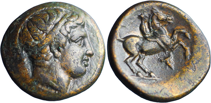 THE MACEDONIAN KINGDOM. PHILIP II. 359-336 B.C. Ae 18 (6.0 g). Head of Apollo right. ® Naked youth on horse prancing right, Bucranium below. |