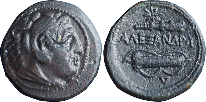 THE MACEDONIAN KINGDOM. ALEXANDER III (The Great). 336–323 BC. Ae 18 (6.7 g). Head of Hercules right wearing lion skin. ® Star, club above legend, bow in bowcase, symbol below. |