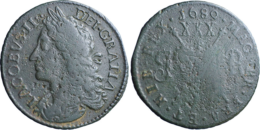 JAMES II. 1685-1691. Copper alloy ’Gunmoney’ Halfcrown. IACOBVS II DEI GRATIA, laureate and draped bust left. ® MAG BR FRA ET HIB REX 1689, crown over sceptres dividing I R; XXX above. Spink # 6579. 32 mm. James II gunmoney halfcrown (large size) dated 1689. The ’gunmoney’ coinage was struck from brass obtained from old cannon, bells and other sources of scrap metal. It was issued by James II as an emergency token currency, which would be exchanged for good silver once he had won the war against his Protestant foe, William III. The month, in this case illegible, was added to the coin as a means by which the redemption could be spread over a convenient period of time. In the event, James was defeated, and after circulating briefly at their intrinsic value the coins were demonetized in 1691. |