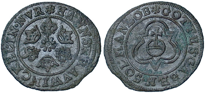 Germany. Hans Krauwinckel II. Brass Jeton. Three crowns, alternately with three lis, arranged around a central rose. Legend reads: HANNS KRAVWINCKEL IN NV (Hans Krauwinckel in Nuremberg). ® Imperial orb within a double tressure of three arches and three angles. Legend reads: GOTTES GABEN SOL MAN LOB (One should praise God’s gifts). Cf. Michael Mitchiner, Jetons, Medalets & Tokens, Vol I, 1539. 22 mm. Hans Krauwinckel II, Nuremberg, Germany. Master 1586, died 1635. |