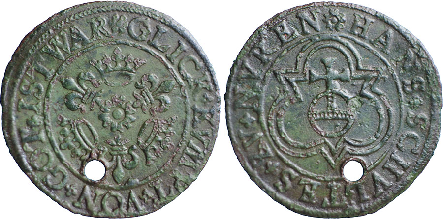Germany. Hans Schultes III. Brass Jeton. Three crowns, alternately with three lis, arranged around a central rose. Legend reads: GLICK KVMPT VON GOT ISTWAR (Truly, good fortune comes from God). ® Imperial orb within a double tressure of three arches and three angles. Legend reads: HANS SCHVLTES ZV NVREN (Hans Schultes at Nuremberg). Cf. Michael Mitchiner, Jetons, Medalets & Tokens, Vol 1, Nos. 1406-1407. UKDFD # 33197. 25 mm. Hans Schultes III, Nuremberg, Germany. Master 1608, last record 1612. Pierced flan. |