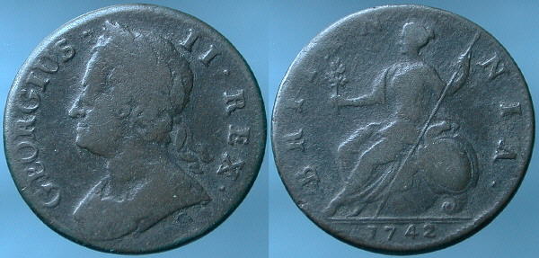 GEORGE II. 1727-1760. Halfpenny. GEORGIUS II REX. Laureate and cuirassed bust left. ® BRITANNIA 1742. Britannia seated left. Spink # 3718. |