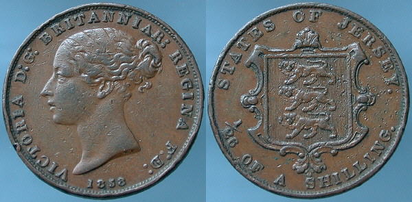 VICTORIA. 1837-1901. One Twenty-Sixth of a Shilling. Young head left, 1858 below. ® Arms of Jersey. Spink # 7002. |
