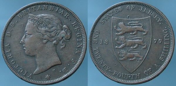 VICTORIA. 1837-1901. One Twenty-Fourth of a Shilling. Head left. ® Spade shield with arms of Jersey, 1877. Spink # 7007. |