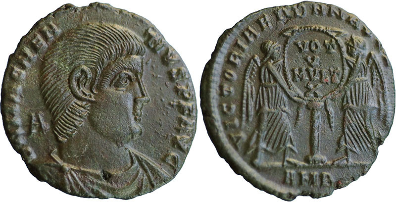 MAGNENTIUS. 350-353 AD. Æ (22mm). DN MAGNEN-TIVS PF AVG, bareheaded, draped, cuirassed bust right, A behind. ® VICTORIAE DD NN AVG ET CAE, two Victories facing one another, holding wreath inscribed VOT/V/MVLT/X supported on short column. Mintmark AMB (Amiens). RIC VIII, 5 (rated scarce). |