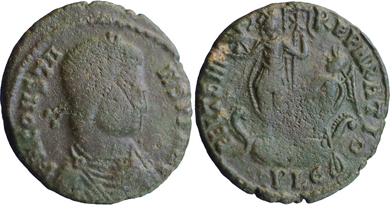 Barbarous copy of a CONSTANS Æ (22mm). Draped & cuirassed bust right. ® FEL TEMP-REPARATIO, emperor on galley left, holding labarum and phoenix on globe; Victory at the helm. Mintmark PLG (Lugdunum). Circa 4th Century. Good style. |