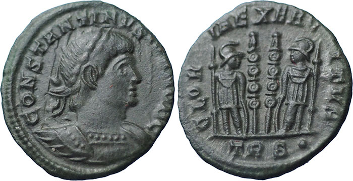 CONSTANTINE II. 317-337 AD. Æ 3 (17 mm). CONSTANTINVS IVN NOB C, laureate, cuirassed bust right. ® GLOR-IA EXERC-ITVS, two soldiers holding spears and shields, two standards in-between. Mintmark TRS dot (Trier). RIC VII, 520. |