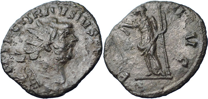 CARAUSIUS. 287-293 AD. Æ Antoninianus (20mm). IMP CARAVSIVS PF AVG. Radiate, cuirassed bust right. ® PAX AVG. Pax standing left holding branch and sceptre. |