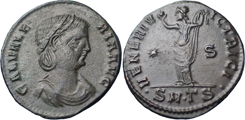 GALERIA VALERIA. 2nd Wife of Galerius. Æ Follis (24mm). GAL VALE-RIA AVG, diademed and draped bust right. ® VENERI V-ICTRICI, Venus standing left, holding apple and raising drapery from shoulder, star in left field, S in right. Mintmark dot SM dot TS dot (Thessalonica). |