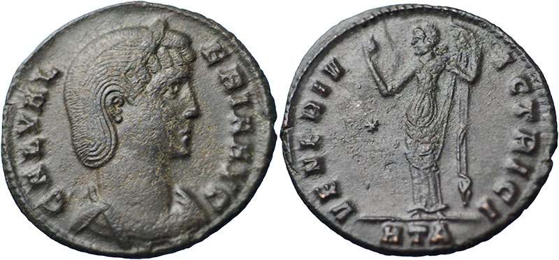 GALERIA VALERIA. 2nd Wife of Galerius. Æ Follis (25mm). GAL VAL-ERIA AVG, diademed and draped bust right. ® VENERI V-ICTRICI, Venus standing left, holding apple and raising drapery from shoulder, star in left field. Mintmark HTA (Heraclea). RIC VI, 50. |