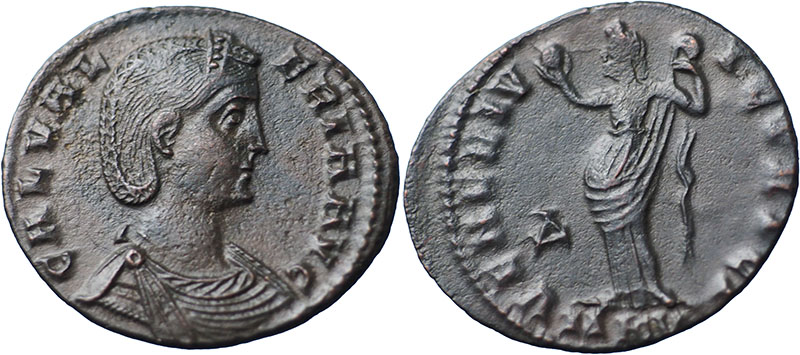 GALERIA VALERIA. 2nd Wife of Galerius. Æ Follis (25mm). GAL VAL-ERIA AVG, diademed and draped bust right. ® VENERI V-ICTRICI, Venus standing left, holding apple and raising drapery from shoulder, delta in left field. Mintmark MKV (Cyzicus). RIC VI, 46. |
