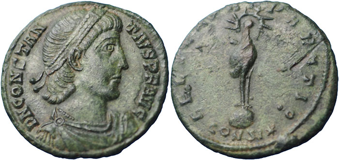 CONSTANTIUS II. 337-361 AD. Æ 3 (18 mm). DN CONSTAN-TIVS PF AVG, pearl-diademed, draped, cuirassed bust right. ® FEL TEMP REPARATIO, radiate phoenix standing right on globe. Mintmark CONSI star (Constantinople). RIC VIII, 93 var. (unlisted officina). For similar see Wildwinds RIC VIII 93. |