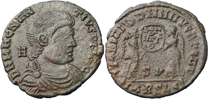 MAGNENTIUS. 350-353 AD. Æ (20mm). DN MAGNEN-TIVS PF AVG, bareheaded, draped, cuirassed bust right, H behind. ® VICTORIAE DD NN AVG ET CAE, two Victories facing one another, holding wreath inscribed VOT / V / MVLT / X, SV below. Mintmark RSLG (Lyons). Early barbarous style. |
