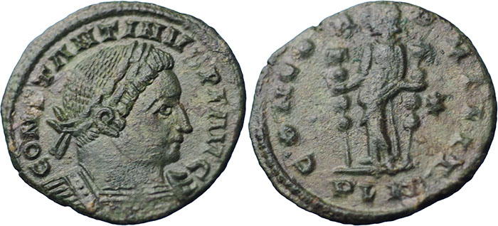 CONSTANTINE I. 307-337 AD. Æ Follis (22mm). CONSTANTINVS PF AVG, laureate, cuirassed bust right. ® CONCOR-D MILIT, Concordia standing left, holding two standards. Star in right field, mintmark PLN (London). RIC VI, 195. |