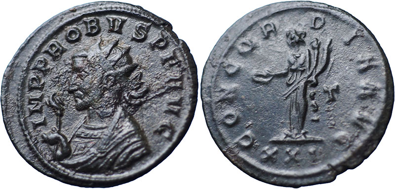 PROBUS. 276-282 AD. Æ Antoninianus (21 mm ). IMP PROBVS PF AVG, radiate bust left, wearing imperial mantle and holding eagle tipped sceptre. ® CONCORDIA AVG, Concordia standing left, holding patera and double cornucopiae. T in right field, XXI in exergue. |