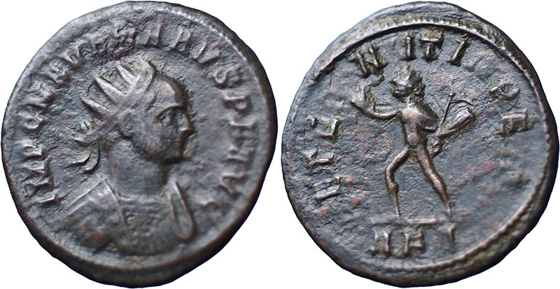 CARUS. 282-283 AD. Æ Antoninianus (21 mm ). Rome mint. IMP C M AVR CARVS P F AVG, radiate, cuirassed bust right. ® AETERNIT IMPERI, Sol walking left, holding whip and raising right hand. AKA in exergue. RIC V-2, 35. |