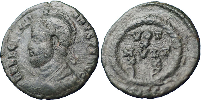 JULIAN II. 360-363 AD. Æ 3 (18.5 mm). DN FL CL IVLI-ANVS PF AVG, helmeted bust left holding spear and shield. ® VOT X MVLT XX in four lines inside laurel wreath. Mintmark SISC (Siscia). |