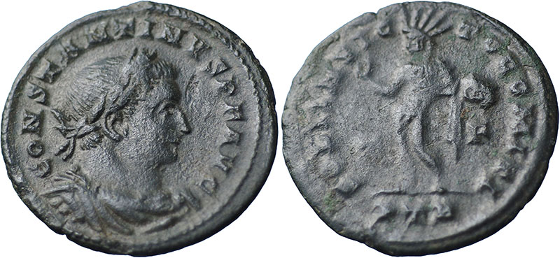 CONSTANTINE I. 307-337 AD. Æ Follis (23mm). CONSTANTINVS PF AVG, laureate, draped, cuirassed bust right. ® SOLI INVIC-TO COMITI. Sol standing left, chlamys falling from left shoulder, globe in left hand, T / F in field, mintmark PTR (Trier). RIC VI, 874. |