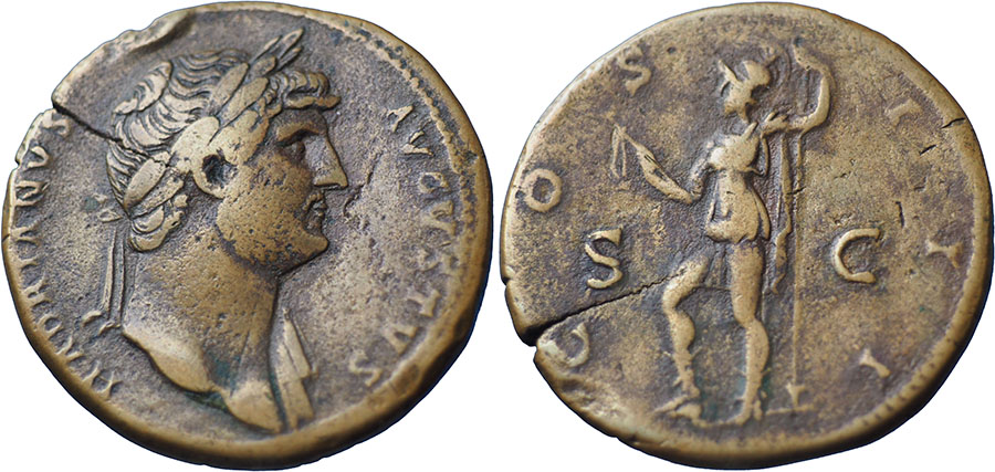 HADRIAN. 117-138 AD. Æ Sestertius (33mm). HADRIANVS AVGVSTVS, laureate head right. ® COS III S-C, Virtus standing left, holding parazonium and spear. RIC II, 638. Old collection piece with brassy tone. |