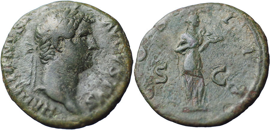 HADRIAN. 117-138 AD. Æ As (26mm). HADRIANVS AVGVSTVS, laureate head right. ® COS III S-C, Salus standing right, feeding snake held in arms from patera. RIC II, 669. |