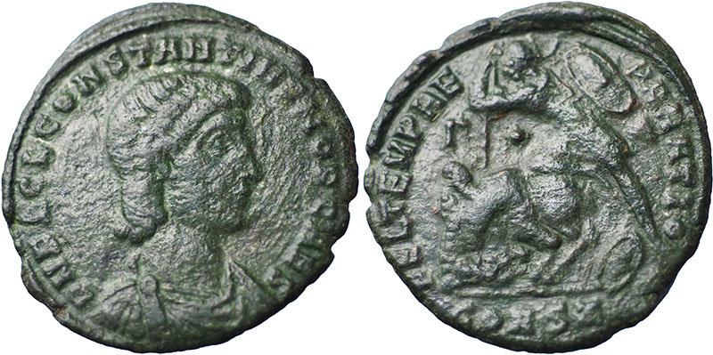 CONSTANTIUS GALLUS. 351-354 AD. Æ (23 mm). DN FL CL CONSTANTIVS NOB CAES, bare head, draped, cuirassed bust right. ® FEL TEMP RE-PARATIO, soldier spearing fallen horseman wearing Phrygian helmet. Gamma dot in left and centre field, mintmark CONSZ (Constantinople). RIC VIII, 107. |