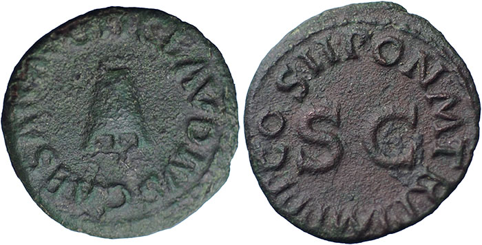 CLAUDIUS. 41-54 AD. Æ Quadran (17 mm). TI CLAVDIVS CAESAR AVG around three legged modius. ® PON M TR P IMP P P COS II around S C. RIC I, 90. |