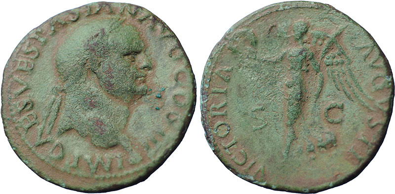 VESPASIAN. 69-79 AD. Æ As (28mm). Lyons mint. IMP CAES VESPASIANVS AVG COS III, laureate head right, globe at point of bust. ® VICTORIA AVGVSTI S C, Victory walking left, holding wreath and palm branch. RIC II, 1175. |