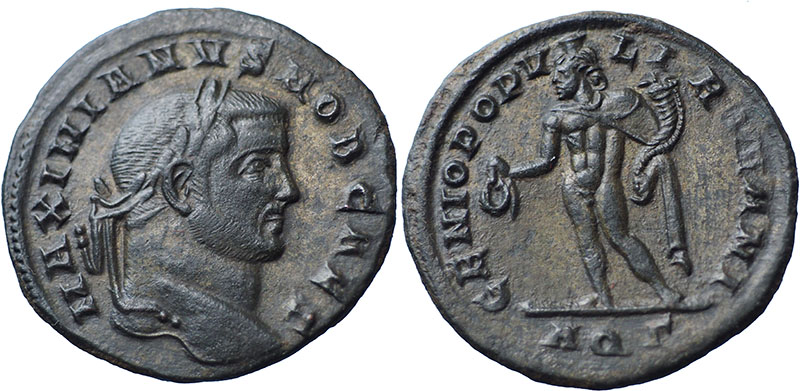 GALERIUS. As Caesar 293-305 AD. Æ Follis (26mm). MAXIMIANVS NOB CAES, Laureate head right. ® GENIO POPV-LI ROMANI, Genius standing left holding patera and cornucopiae. Mintmark AQ gamma (Aquileia). RIC VI, 24b. |