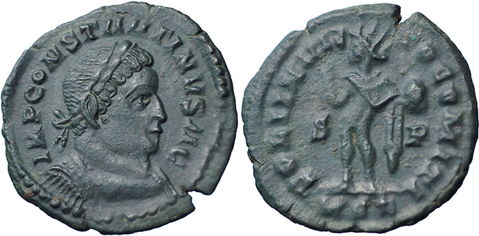 CONSTANTINE I. 307-337 AD. Æ Follis (21mm). IMP CONSTANTINVS AG, laureate, cuirassed bust right. ® SOLI INVIC-TO COMITI. Sol standing left, chlamys falling from left shoulder, globe in left hand, S-P in field, mintmark MSL (London). RIC VII, 70. Rated r4. Extremely rare. |