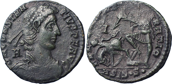 CONSTANTIUS II. 337-361 AD. Æ (21 mm). DN CONSTAN-TIVS PF AVG, pearl diademed, draped, cuirassed bust right, A behind bust. ® FEL TEMP RE-PARATIO, soldier spearing fallen horseman who is bare-headed, reaching backwards. I in left field, mintmark ASIS dot S dot (Siscia). RIC VIII, 346. |