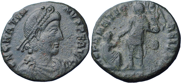 GRATIAN. 367-383 AD. Æ (23 mm). D N GRATIA-NVS P F AVG, pearl diademed, draped, cuirassed bust right. ® Emperor standing, facing, head left, with right hand raising kneeling turreted woman and holding Victory on globe in left. B in right field, mintmark SMTES (Thessalonica). RIC IX, 37a. |