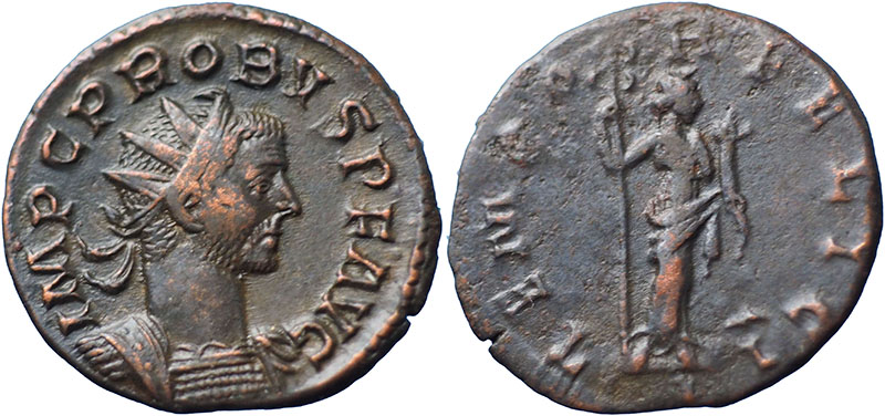 PROBUS. 276-282 AD. Æ Antoninianus (21 mm). Mint of Lyon. IMP C PROBVS P F AVG, radiate, cuirassed bust right. ® TEMPOR FELICI, Felicitas standing right, holding caduceus and cornucopiae. Mintmark I. RIC V-2, 104. |