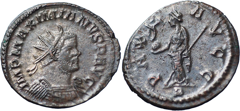MAXIMIANUS. 286-310 AD. Æ Antoninianus (21 mm). Mint of Lyon. IMP MAXIMIANVS P AVG, radiate cuirassed bust right. ® PAX AVGG, Pax standing left holding Victory and transverse sceptre. Mintmark B. RIC V-2, 398. Much of the silver surface remains. |