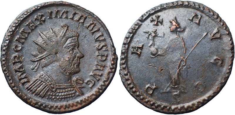 MAXIMIANUS. 286-310 AD. Æ Antoninianus (21 mm). Mint of Lyon. IMP C MAXIMIANVS P AVG, radiate cuirassed bust right. ® PAX AVGG, Pax standing left, holding Victory on globe and sceptre. Mintmark S. RIC V-2, 402. |