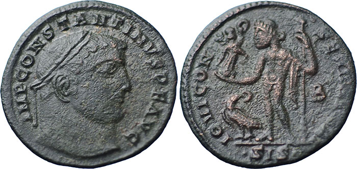 CONSTANTINE I. 307-337 AD. Æ Follis (21mm). IMP CONSTANTINVS PF AVG, laureate head right. ® IOVI CON-SERVATORI, Jupiter standing left, holding Victory on globe and sceptre, eagle with wreath at foot left. B in right field. Mintmark dot SIS dot (Siscia). RIC VII, 15. (rarity r1). |