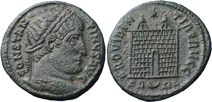 CONSTANTINE I. 307-337 AD. Æ 3 (19mm). CONSTAN-TINVS AVG, laureate head right. ® PROVIDEN-TIAE AVGG, campgate, two turrets, ten layers, star above, no door. Mintmark SA-crescent-RL (Arles). RIC VII, 286. |