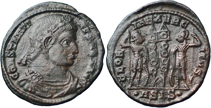 CONSTANTINE I. 307-337 AD. Æ 3 (18mm). CONSTANTI-NVS MAX AVG, diademed, draped and cuirassed bust right. ® GLOR-IA EXERC-ITVS, two soldiers standing, holding spears and shields, two standards between. Mintmark dot SIS dot (Siscia). RIC VII, 235. |