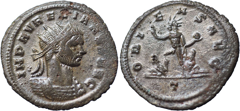 AURELIAN. 270-275 AD. Æ Antoninianus (22 mm). Mint of Rome. IMP AVRELIANVS AVG, radiate, cuirassed bust right. ® ORIENS AVG, Sol walking left, holding globe and raising right hand, foot on one of two captives at foot. Mintmark T. RIC V-1, 62. |