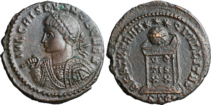 CRISPUS. 317-326 AD. Æ 3 (19mm). Laureate bust left holding spear over right shoulder and shield on left arm. ® BEATA TRANQVILLITAS altar inscribed VO/TIS/XX. mm STR. (Trier). RIC VII, 347 var. A very rare variety, the shield decorated with she wolf suckling Romulus and Remus. |