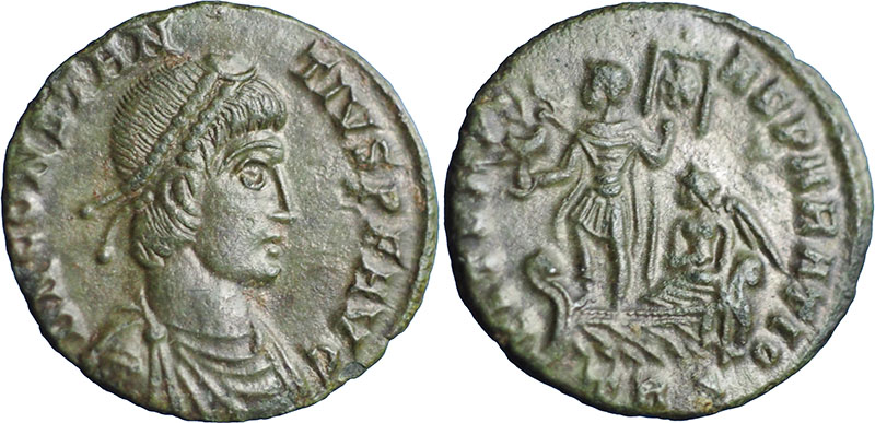 CONSTANTIUS II. 337-361 AD. Æ Centenionalis (22mm). DN CONSTAN-TIVS PF AVG, pearl diademed, draped and cuirassed bust right. ® FEL TEMP-REPARATIO, Constantius standing left on galley holding Phoenix and labarum. Victory seated behind. Mintmark TRS (Trier). RIC VIII, 214. |