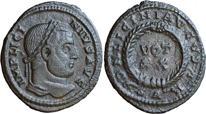 LICINIUS I. 308-324 AD. Æ 3 (19mm). IMP LICI-NIVS AVG, laureate head right. ® DN LICINI AVGVSTI around VOT XX within wreath, dot in flower-shaped badge at top of wreath. Mintmark: SA (Arles). RIC VII, 229. |