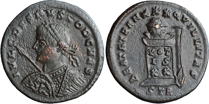 CRISPUS. 317-326 AD. Æ 3 (19mm). Laureate bust left holding shield and forward pointing spear. ® BEATA TRANQVILLITAS altar inscribed VOT/IS/XX. mm STR (Trier). RIC VII, 308 var. A very rare variety, the shield decorated with she wolf suckling Romulus and Remus. |